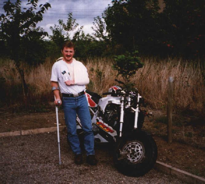 This was my 10 day old 1995 YZF 750 R after a Mazda 626 driver decided it would be a good idea to over take a lorry, whilst approaching a blind bend. Fortunately I was wearing Crowtree leathers and was spared from any serious and lasting injuries. Anyone thinking of buying off-the-peg leathers think again. This could happen to you and would you trust them.?? I have bought a second set of Crowtree leathers and to be honest, I wouldn't put anything else on when riding on the road or track. The cost of the full one piece suit, with my own unique design, came to just £710. Now try and find somewhere that you can get that quality and value and I bet you can't do it. Take my advice. I've raced in them, used them for Sunday thrashes and even everyday commuting and they're as comfortable and good now as the day I first got fitted out.